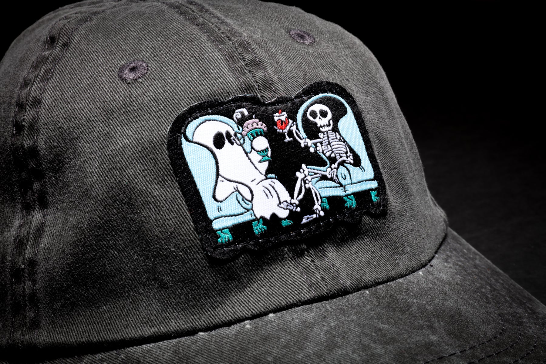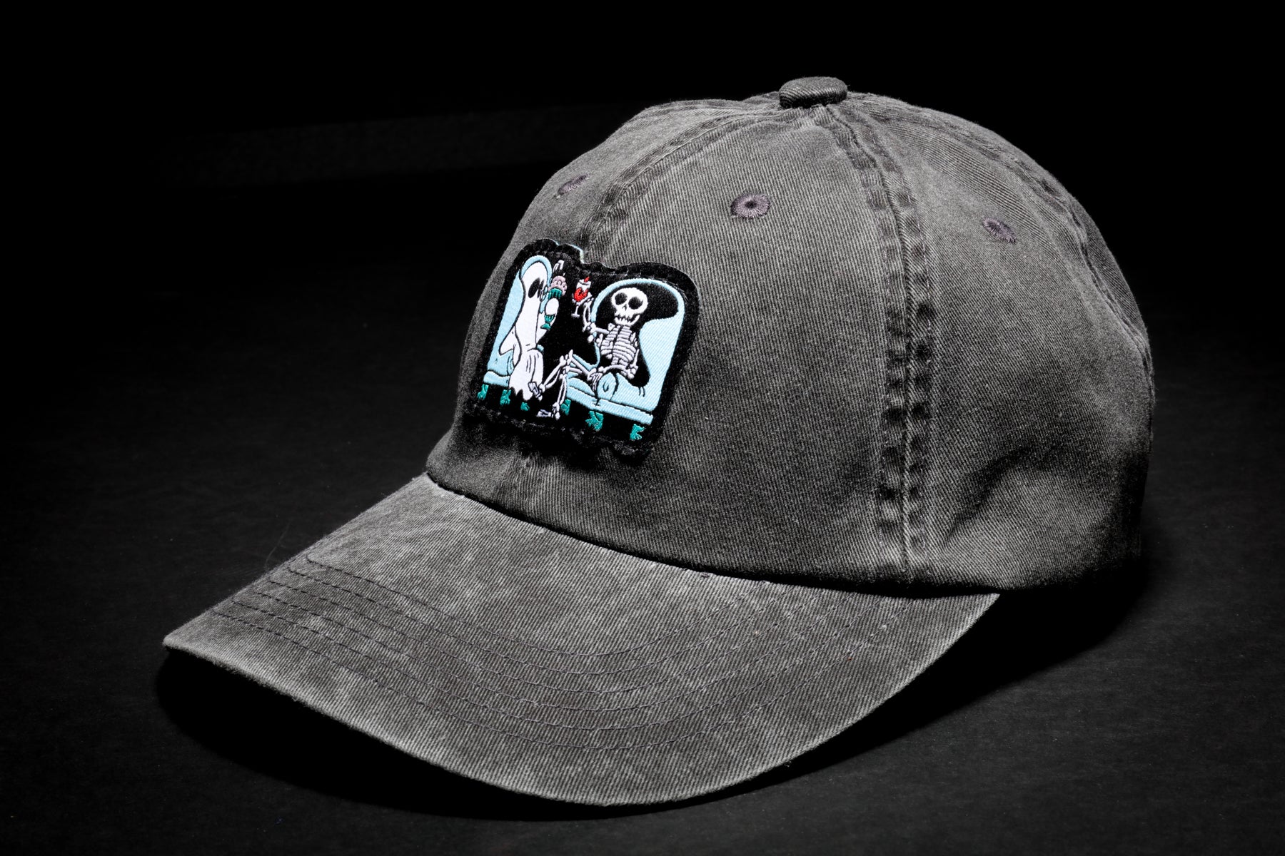 The Boos Logo on the front of a washed-black dad hat.
