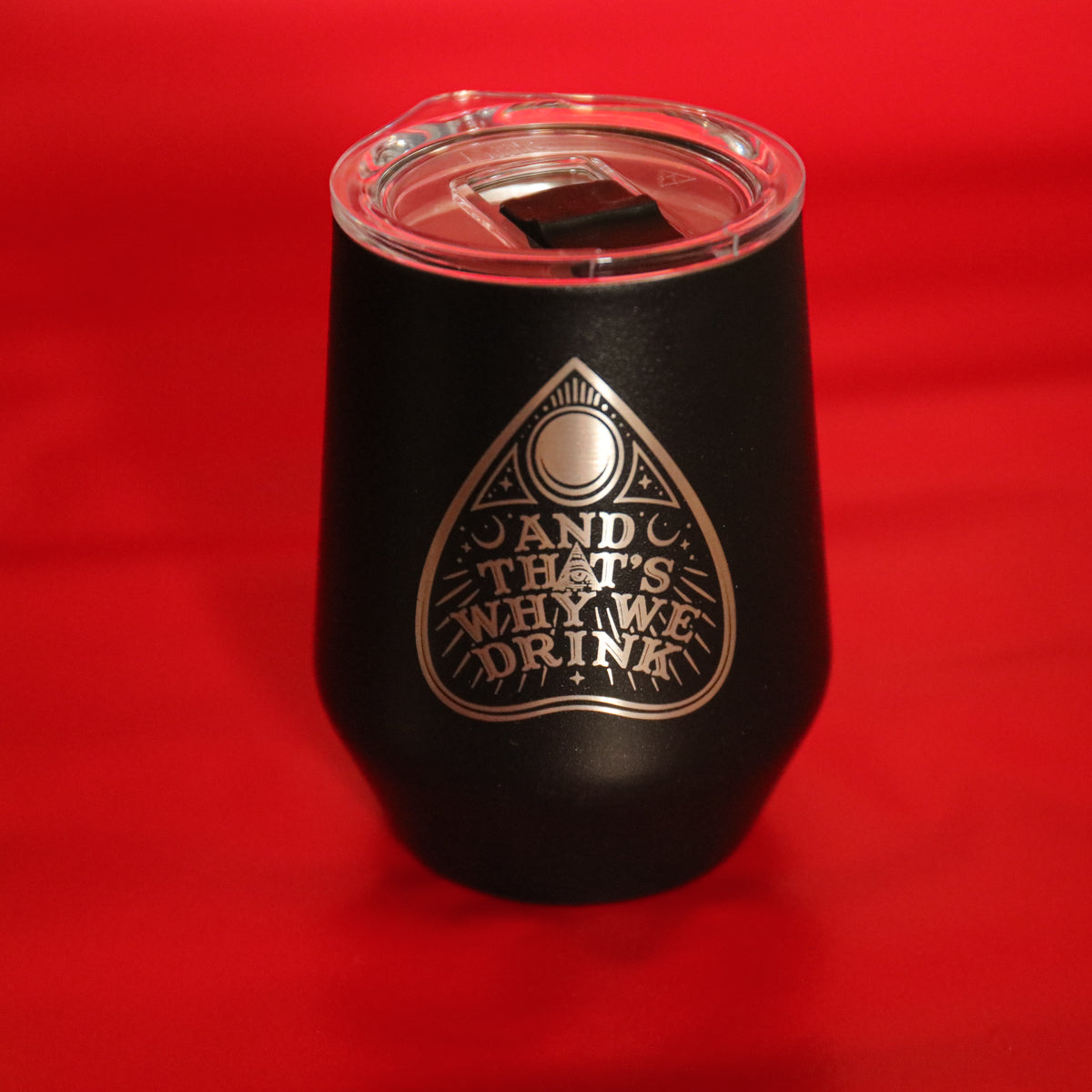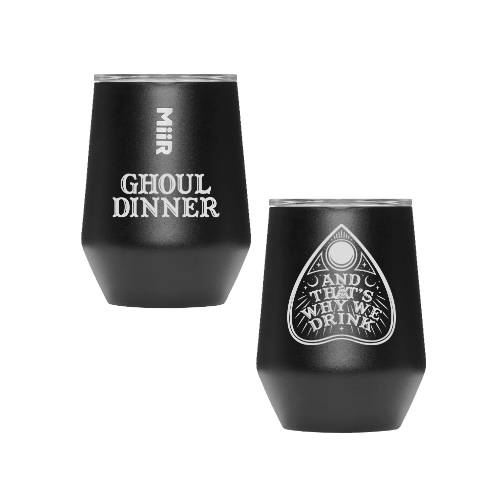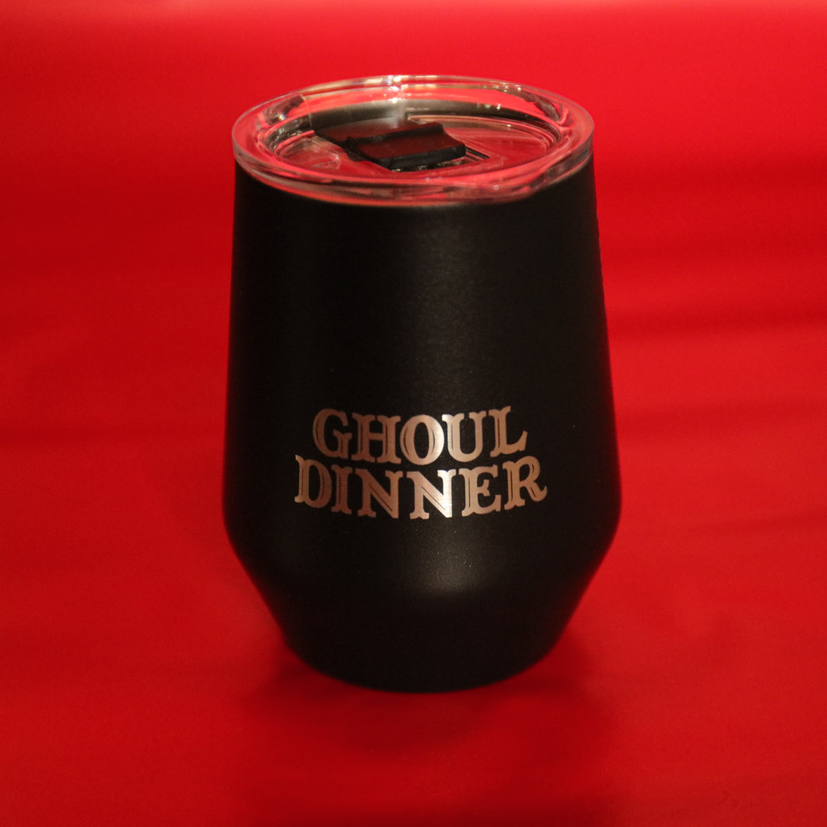 The Ghoul Dinner design featured on a 10 oz. black MiiR Wine Tumbler.