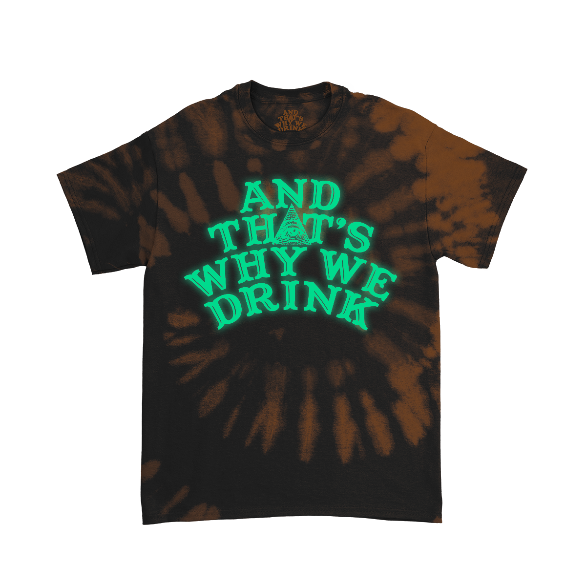 The And That's Why We Drink Logo, printed in glow in the dark ink on a comfortable, standard-fitting orange dyed black shirt.