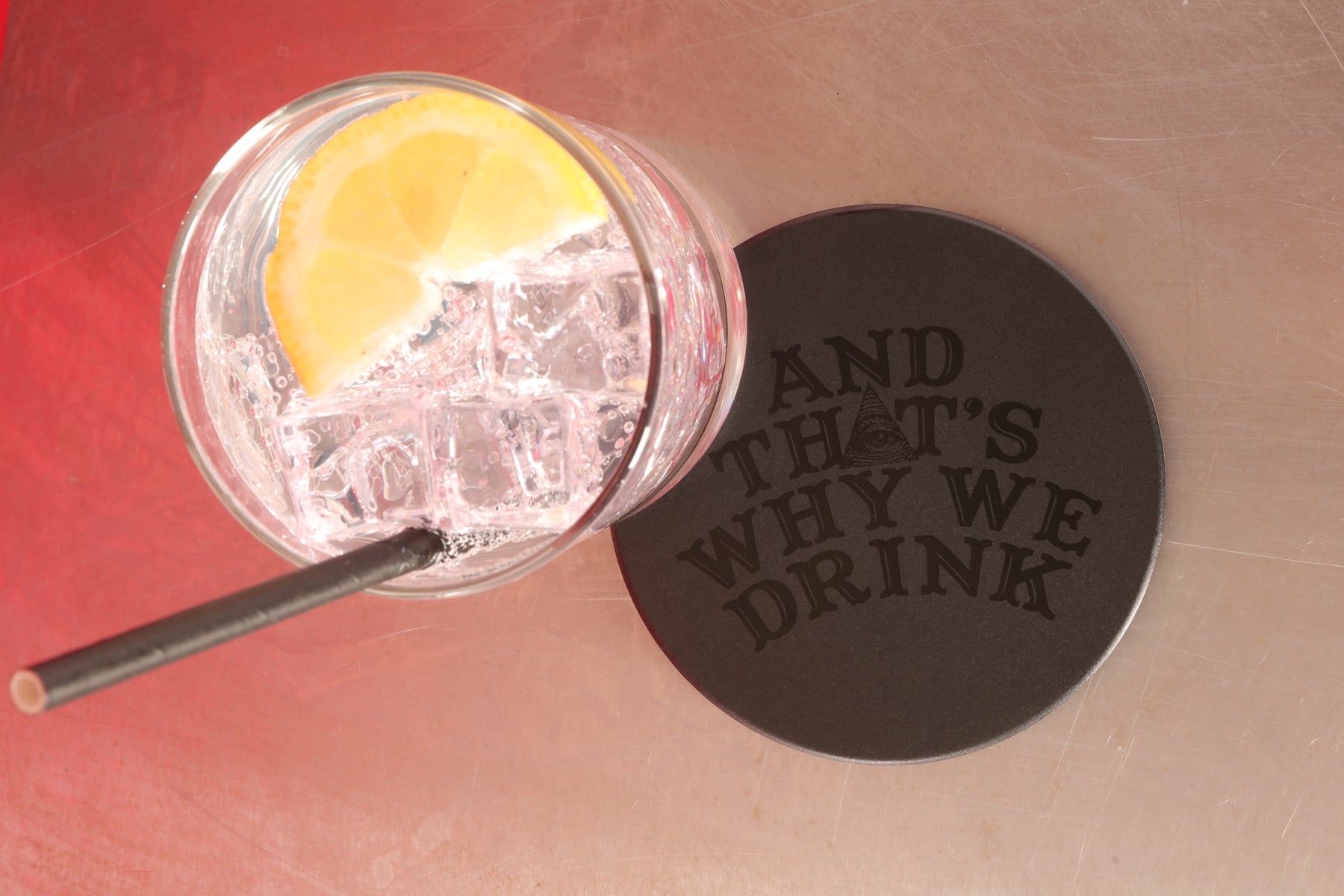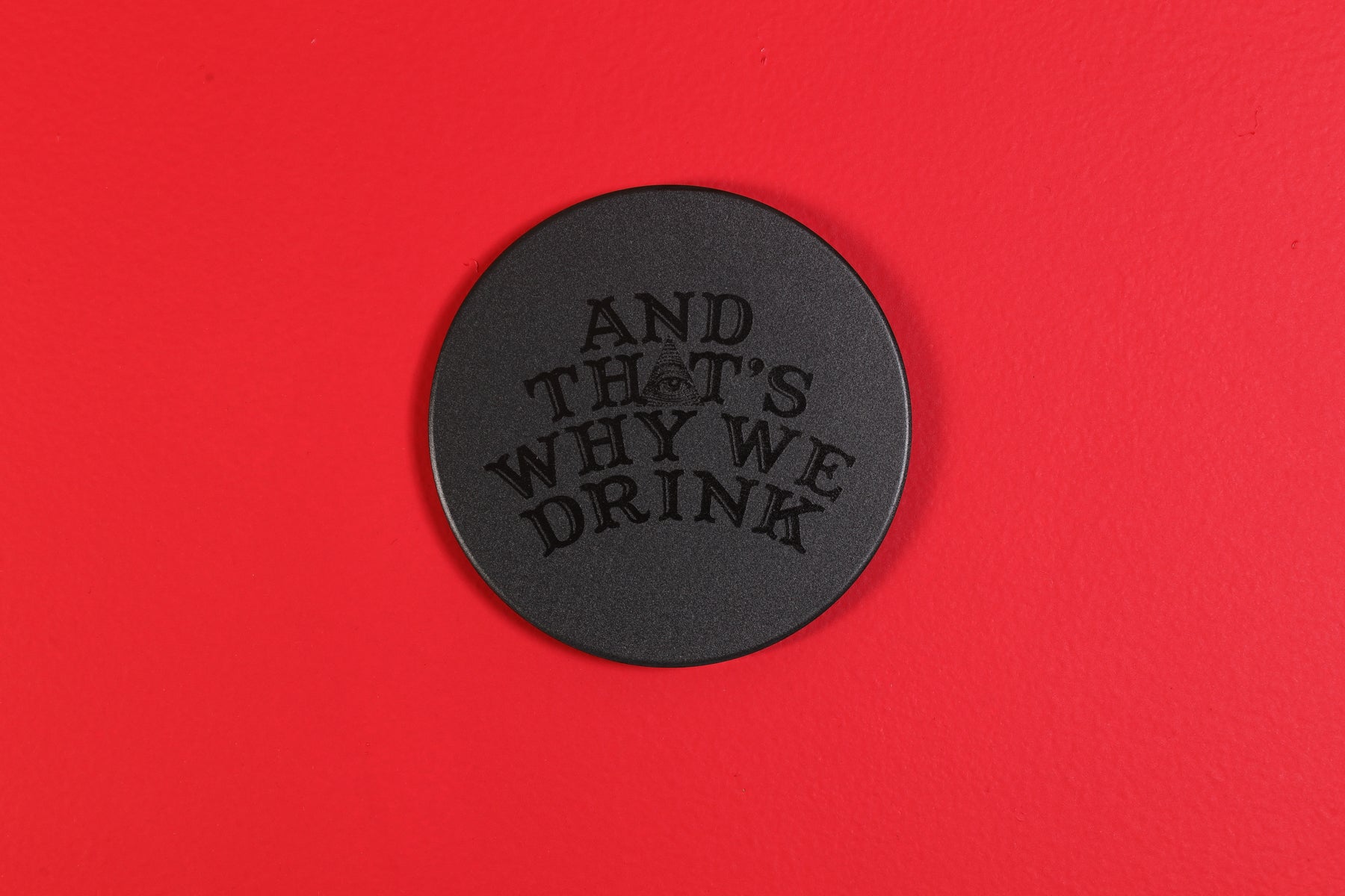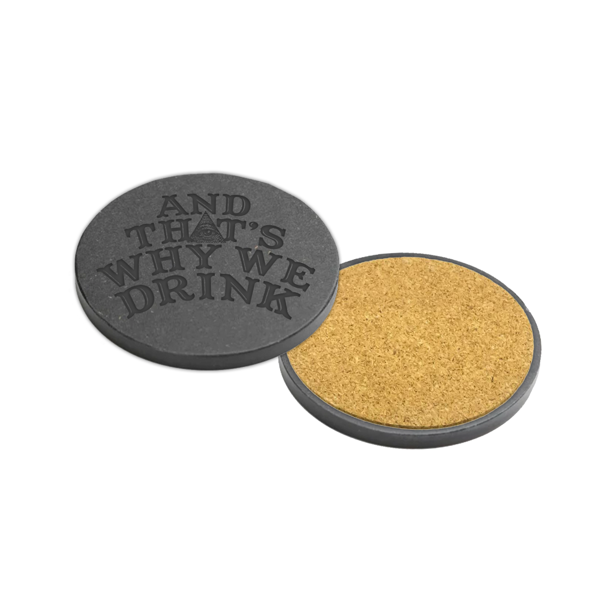The Logo is debossed on a black ceramic coaster with a cork bottom.