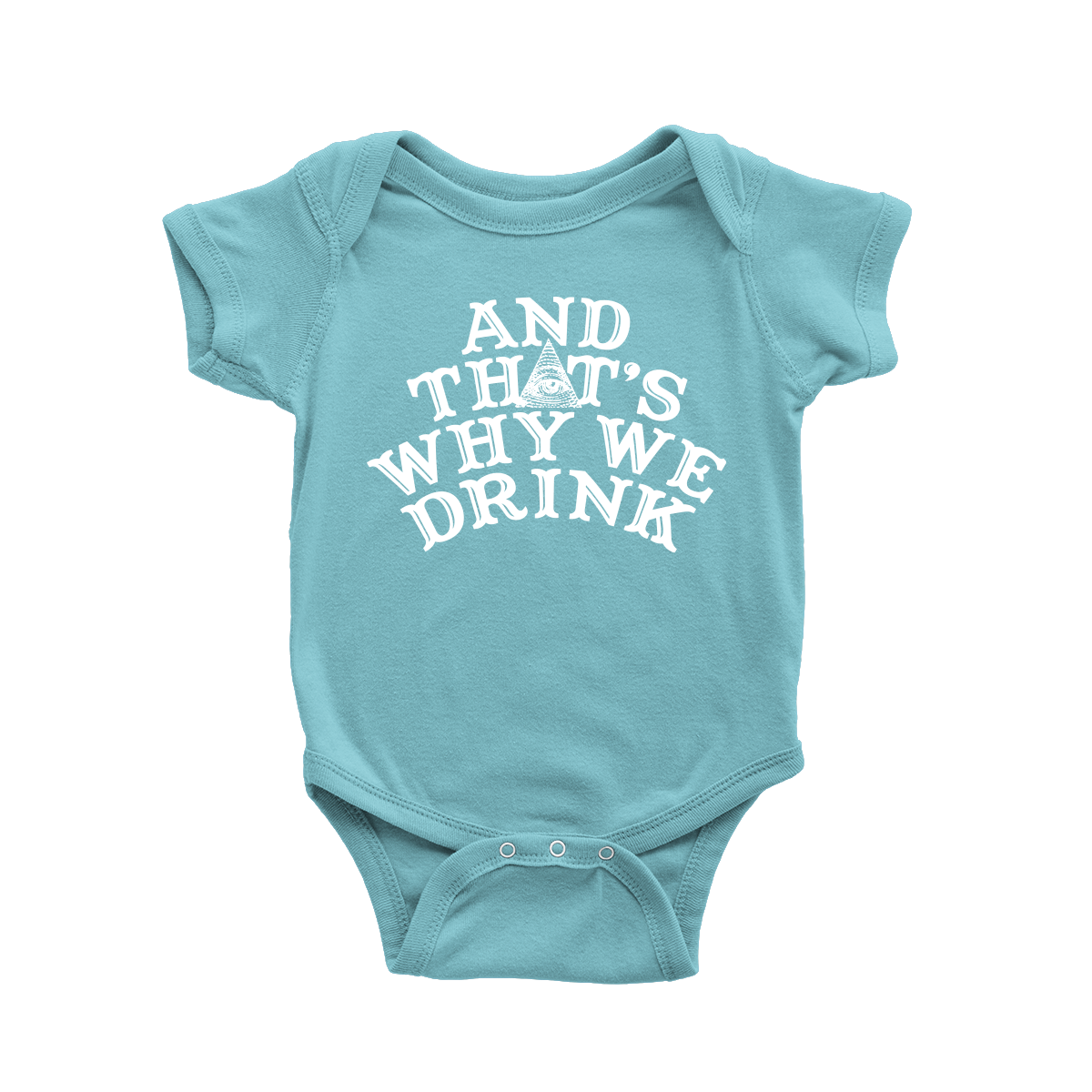 The And That's Why We Drink Logo, printed on a comfortable, standard-fitting caribbean-colored baby onesie.