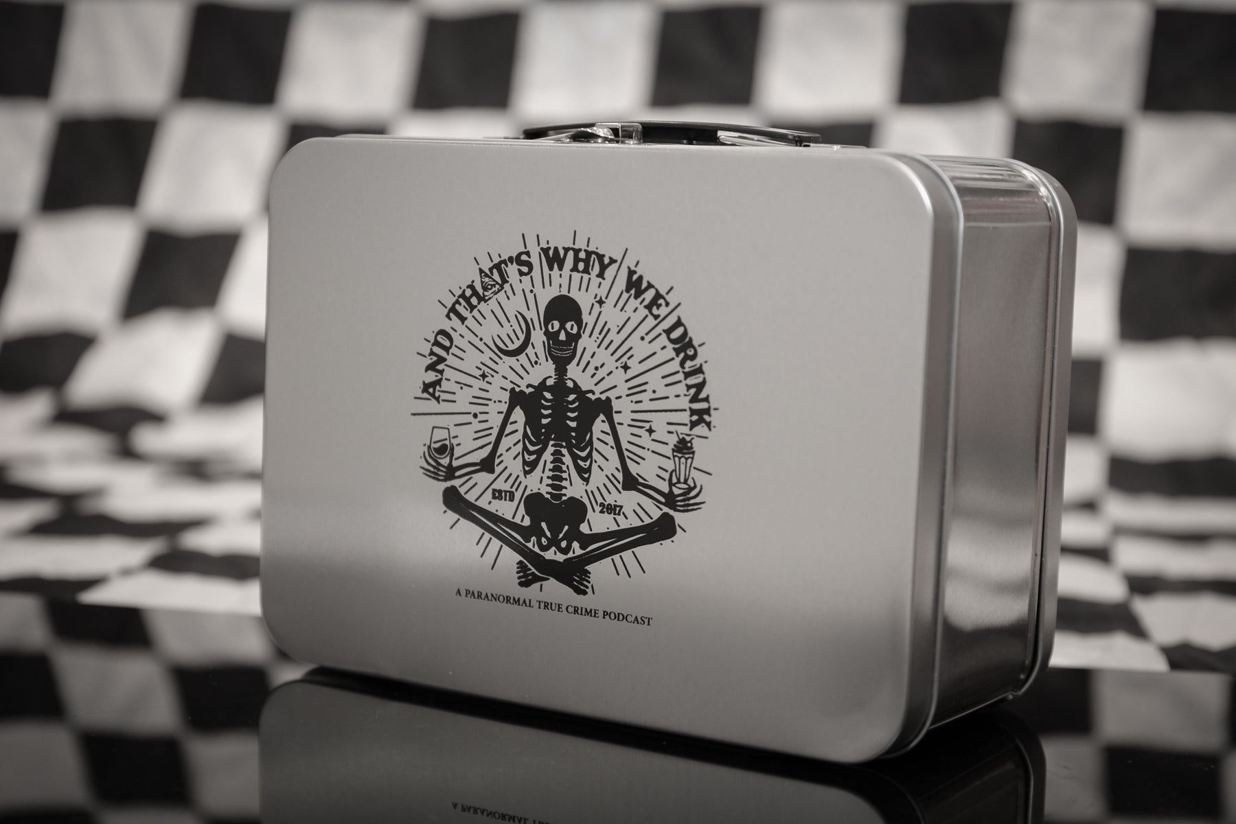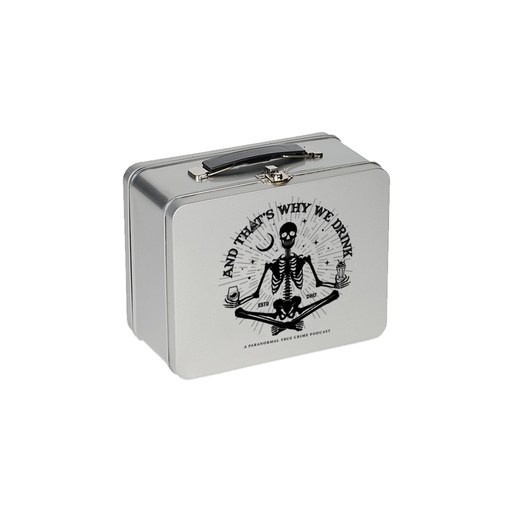 The Meditating Skeleto design featured on a silver tin lunch box.