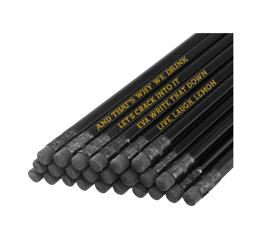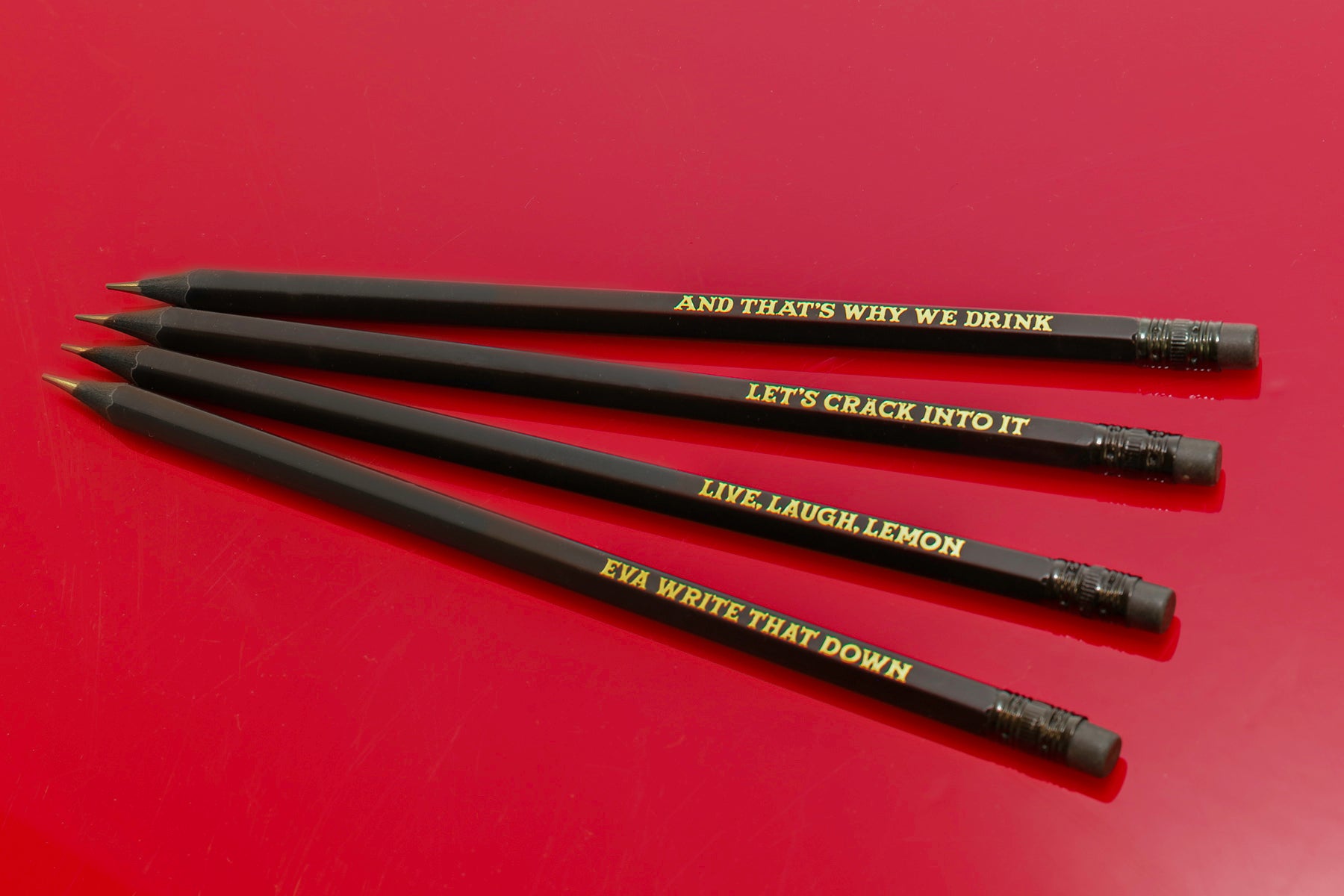 A 4 pack of black pencils featuring different phrases printed on the pencils.
