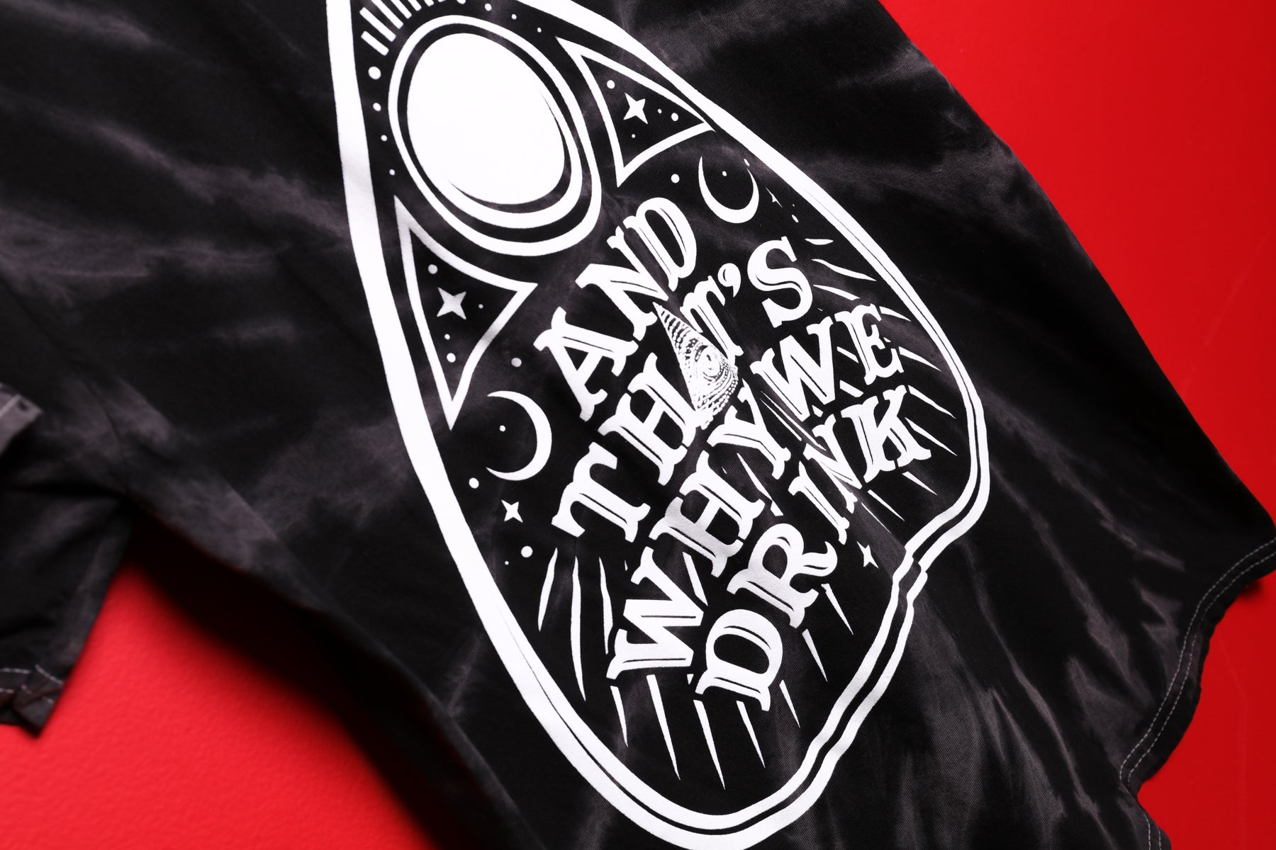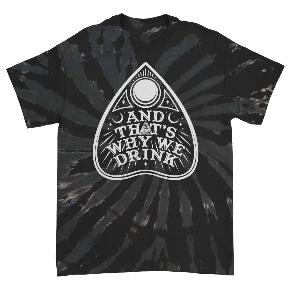 The And That's Why We Drink Planchette Logo design, printed on a comfortable, standard-fitting black swirl dyed t-shirt.