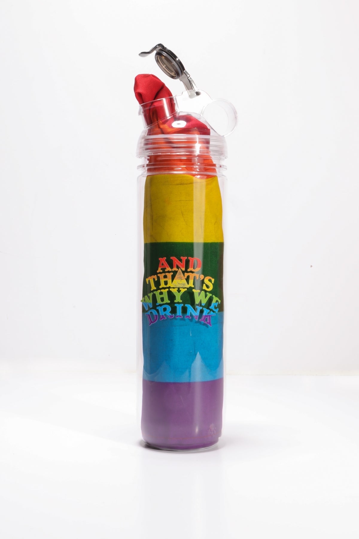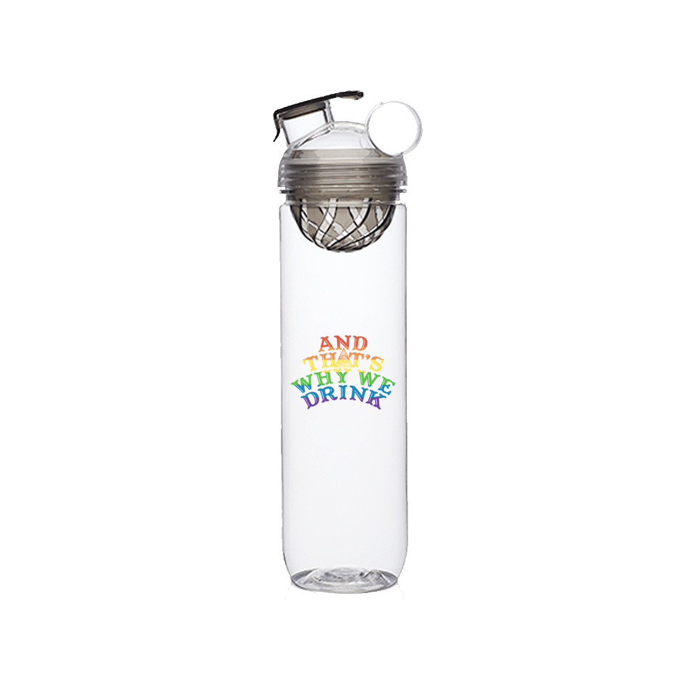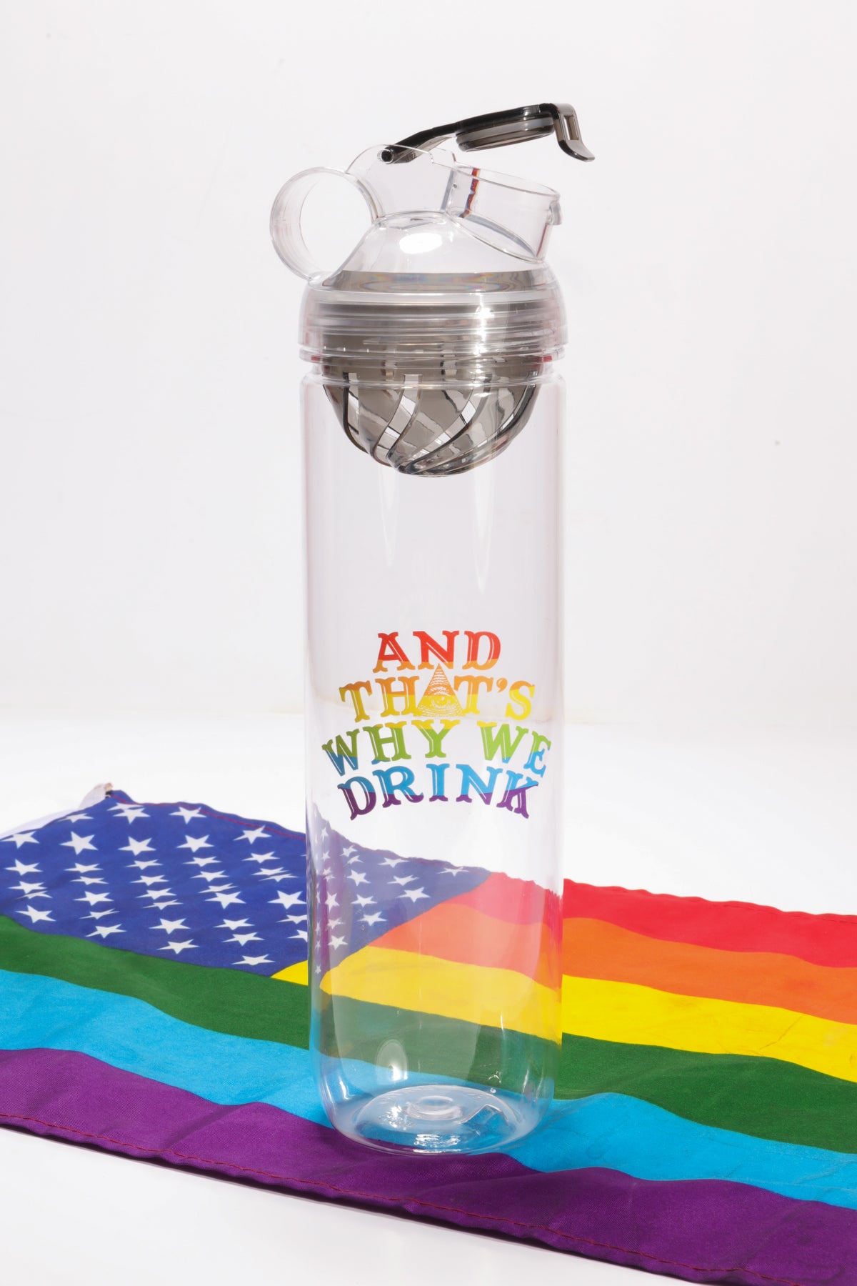The And That's Why We Drink Pride Logo is featured on a 27 oz. infuser water bottle