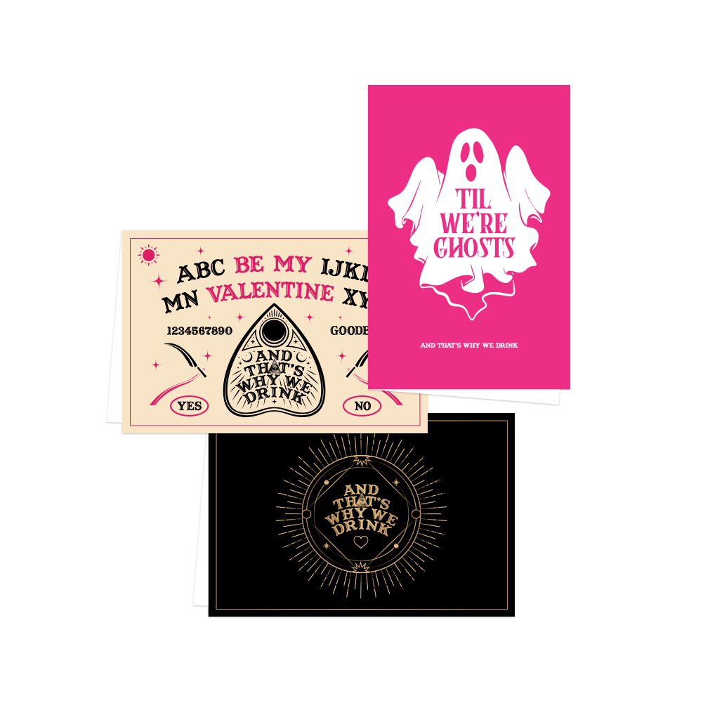 A 3-pack of And That's Why We Drink Valentine's Day greeting cards.