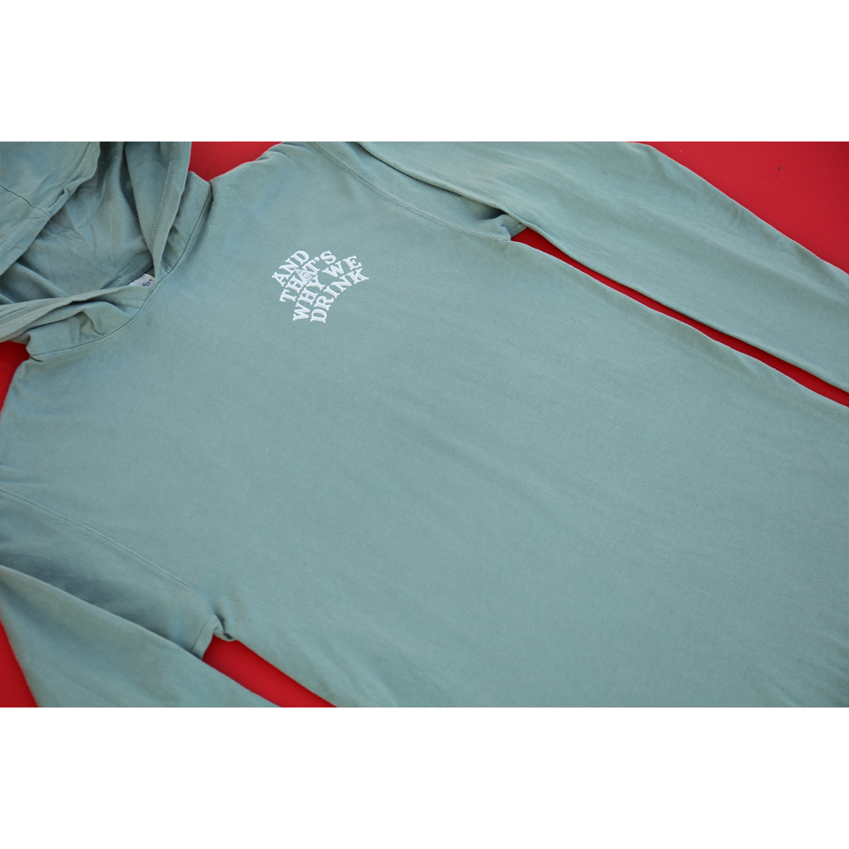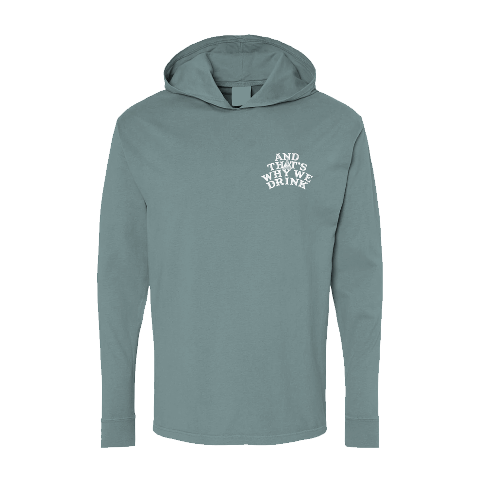 The And That’s Why We Drink Logo, printed on a comfortable, relaxed-fitting cypress green long sleeve shirt with a hood.