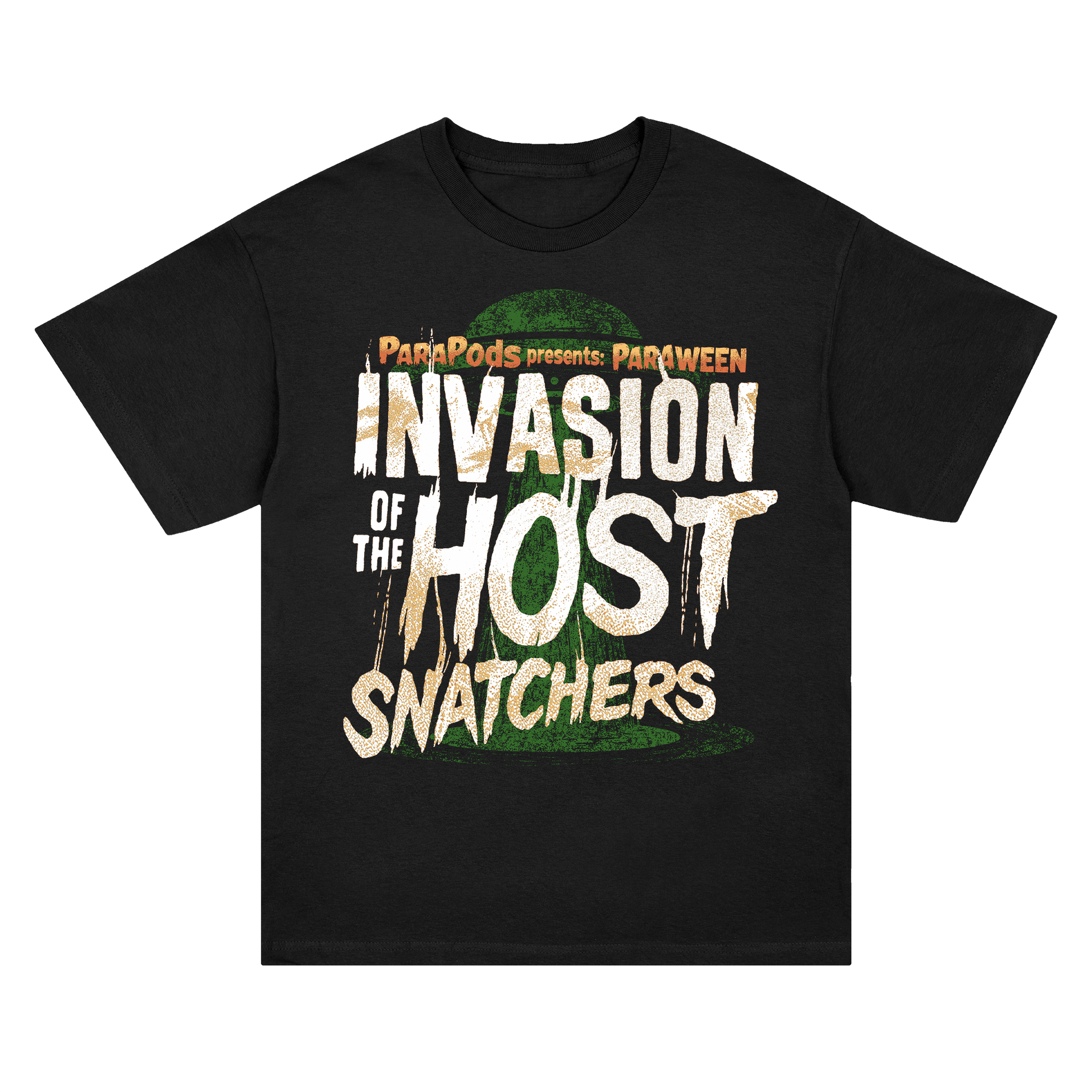 The ParaPods UFO Beam Host design, printed on a comfortable, standard-fitting black Comfort Colors t-shirt.